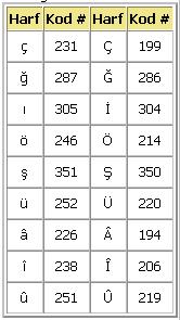 ASCII standardında yeralmayan Türkçe harfler ve Evrensel kod (Unicode) değerleri yandaki çizelgede verilmiştir.